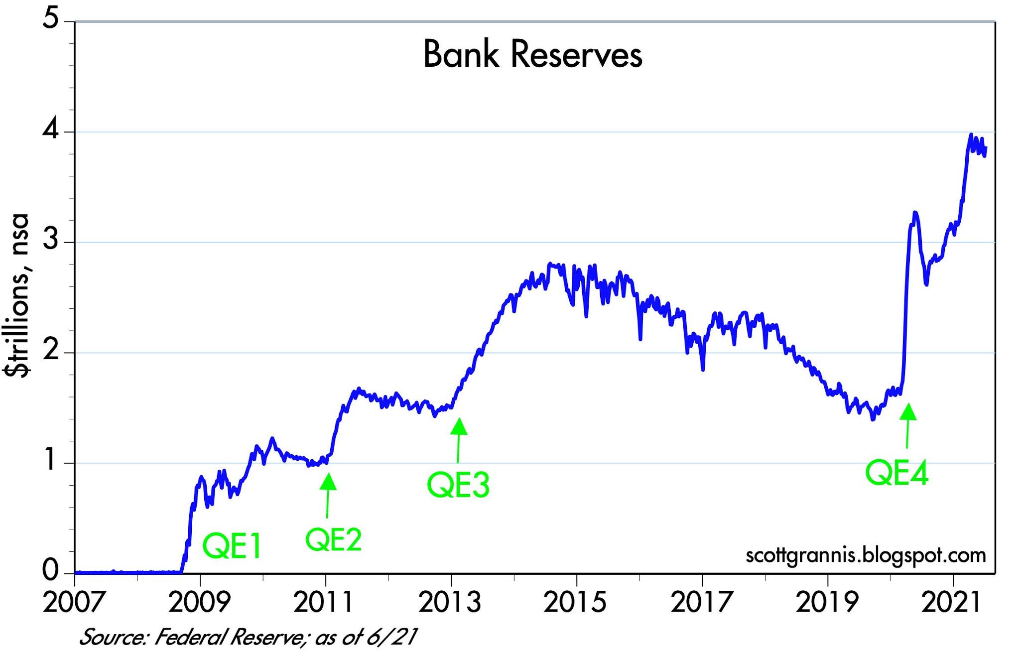 The Fed reduced the interest it paid on reserves to 0.1% in early 2020, but recently raised it to 0.15%. Once the Fed stops paying interest on these huge ‘buffer stocks’ of bank reserves, the Fed felt the banks would be more incentivized to lend them out knowing if this did happen inflation would be expected to skyrocket. |