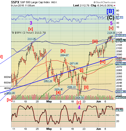 VIX appears to be consolidating between its 50-day Moving Average at 14.50 and its 2-hour mid-Cycle resistance at 14.73. It also left an open gap at 14.00 and doesn’t appear capable of filling it. These gaps, by the way, are indicators of a third wave in action.