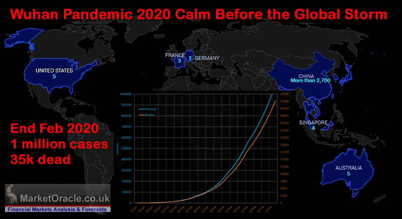 Given the exponential rate of spread of the virus, then by the end of February 2020 as many as 1 million people could be infected globally, that at a 3.5% fatality rate would result in 35,000 deaths. Though the true fatality rate will likely be significantly higher, and likely the virus has already spread to most nations (including Britain) given that approx 1 million Chinese students have traveled back to foreign Universities after the New year holidays.