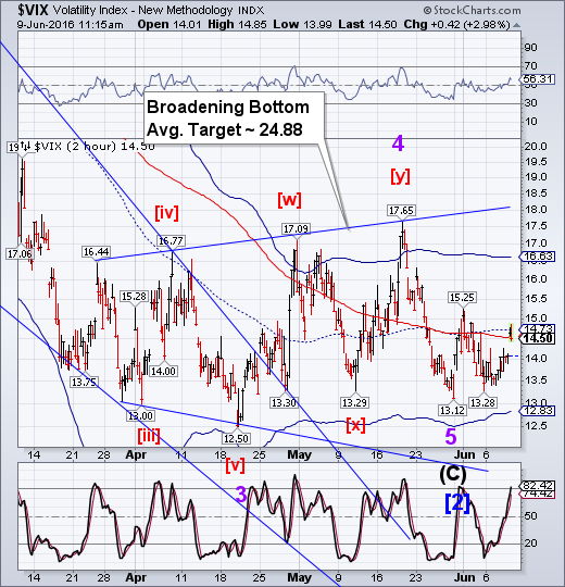 VIX appears to be consolidating between its 50-day Moving Average at 14.50 and its 2-hour mid-Cycle resistance at 14.73. It also left an open gap at 14.00 and doesn’t appear capable of filling it. These gaps, by the way, are indicators of a third wave in action.